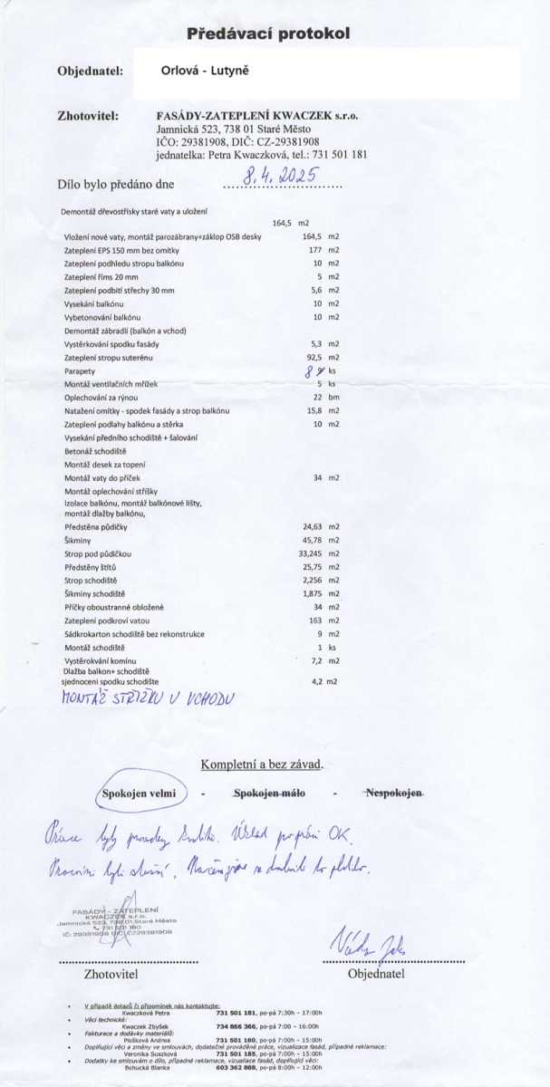 Spokojen velmi. Práce byly provedeny kvalitně. Úklid po práci OK. Pracovníci byli slušní. Na čem jsme se domluvili, to platilo.