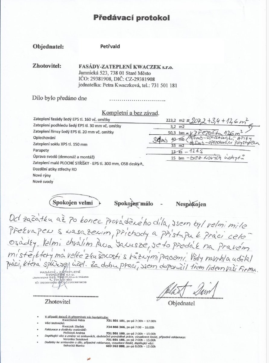 Od začátku až po konec prováděného díla jsem byl velmi mile překvapen s nasazením, příchody a přístupem k práci celé osádky. Velmi chválím pana Janusze, je to předák na pravém místě, který má velké zkušenosti s různými pracemi. Vždy navrhl a udělal práci, která splňuje účel. Za dobu prací jsem doporučil třem lidem vaši firmu.